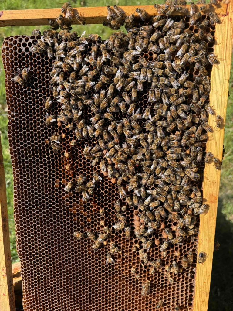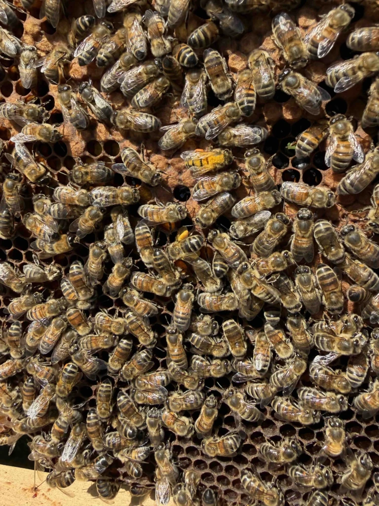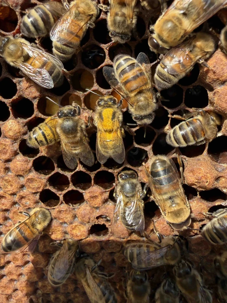 Superbe visite avec une météo très agréable. On a pu voir  les reines, sur la première photo la reine est présente mais bien cachée si vous voulez participer au « ou est Charly »…   La deuxième ruche est plus populeuse, on voit cependant ces butineuses couverte de pollen orange. Je ne sais pas de quelle plante il s’agit mais ces petits renards sont tellement mignons !!!!