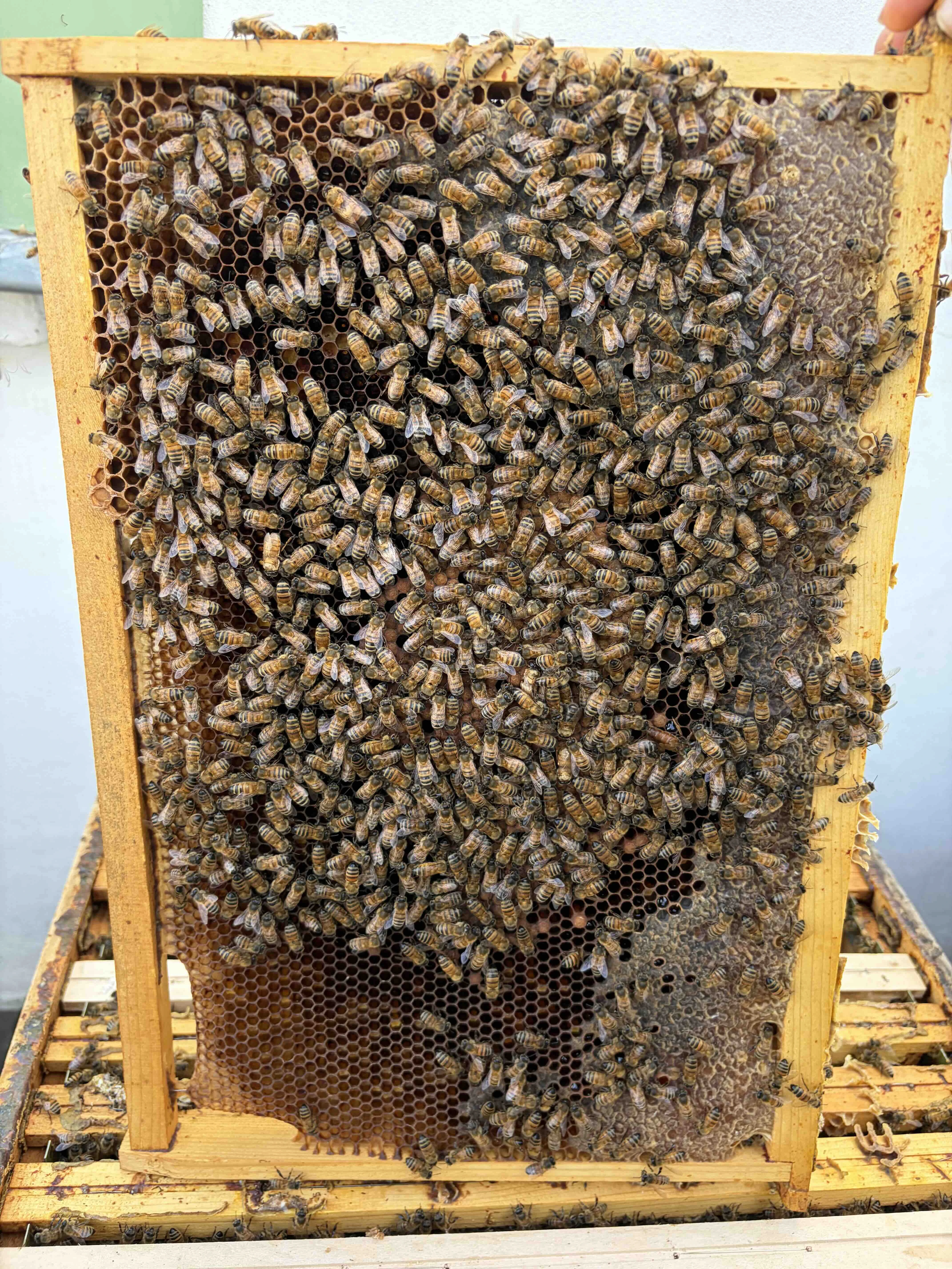 Je vérifie que la colonie ne se développe pas ni trop lentement, ni trop rapidement. La colonie est très forte, je prélève donc des cadres remplis d’abeilles pour en ajouter des vides. Le coté bouillant va redescendre en pression et elle ne devrait pas essaimer. Si vous souhaitez jouer à « où est Charlie » : trouvez la reine !!!!