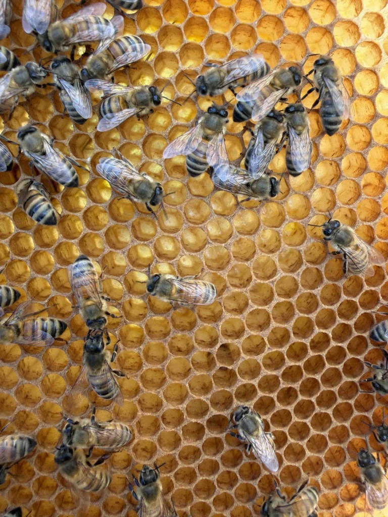 Les abeilles ont bien commencé à remplir la première hausse, et dans le corps de ruche la reine a pondu des oeufs, qui sont maintenant des larves en métamorphose, des nymphe sur les cadres de bord à bord ! C’est vraiment une colonie dynamique !