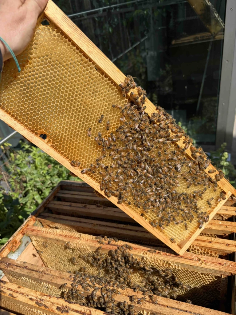 Les abeilles sont encore bien nombreuses, la ruches est lourde : il y a de bonnes réserves pour passer l’hiver. Et bonne dégustation !