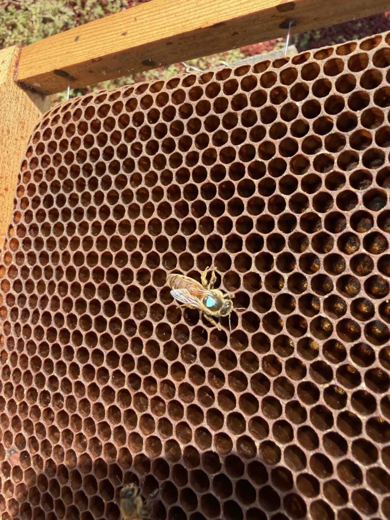 La colonie a continué de récolter. Les abeilles ont de bonnes réserves, elles ont cependant réduit leurs surfaces de couvain. Il y a encore des mâles à ce moment de l’année et voici la reine.