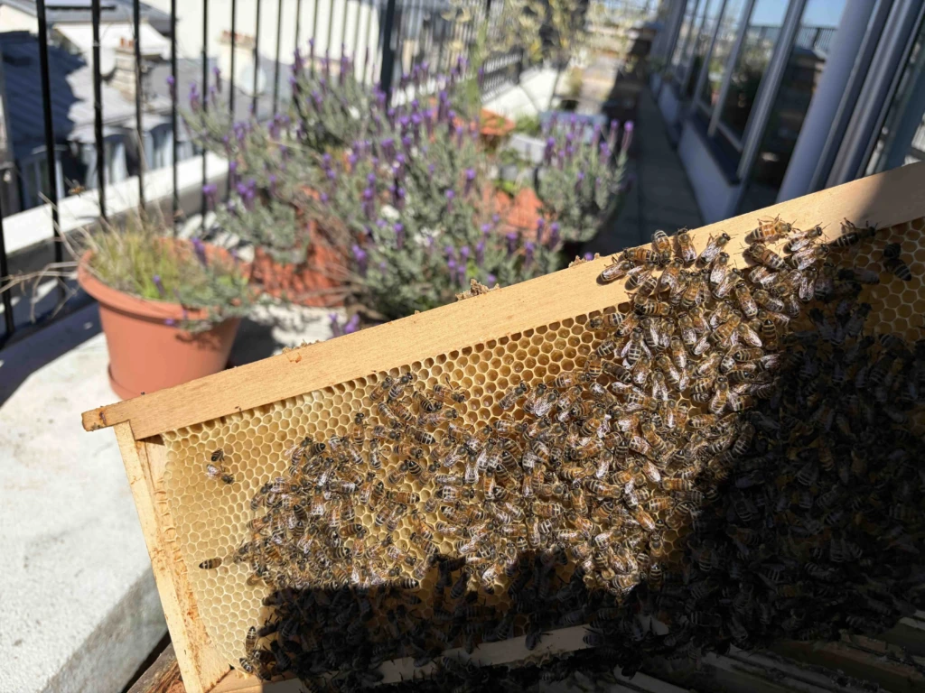 Les colonies commencent à prendre de l’ampleur. Les aléas climatiques : chaud, froid, chaud, froid, les abeilles les connaissent bien et gèrent leurs réserves en collectant beaucoup de nectar et de pollen, lorsqu’elles peuvent sortir. Cependant, elles consomment énormément pour chauffer le couvain (futures abeilles à naître) et produire de la gelée royale. Heureusement, les fleurs sont au rendez-vous ! Le colza est facilement repérable grâce à ses fleurs jaunes. On peut voir des grands champs, en grande banlieue, mais il y a aussi de nombreux pieds épars en ville. Les lauriers palmes, plus urbains, terminent leur floraison. Ils sont de toutes les haies et produisent nectar et pollen. Mais nous sommes déjà en plein boom de la floraison des marronniers d’Inde, en plus des pissenlits. Tous ces pollens se retrouvent transportés par les abeilles sur leurs pattes postérieures, pour former une palette de couleur dans les alvéoles situés en bordure du couvain.