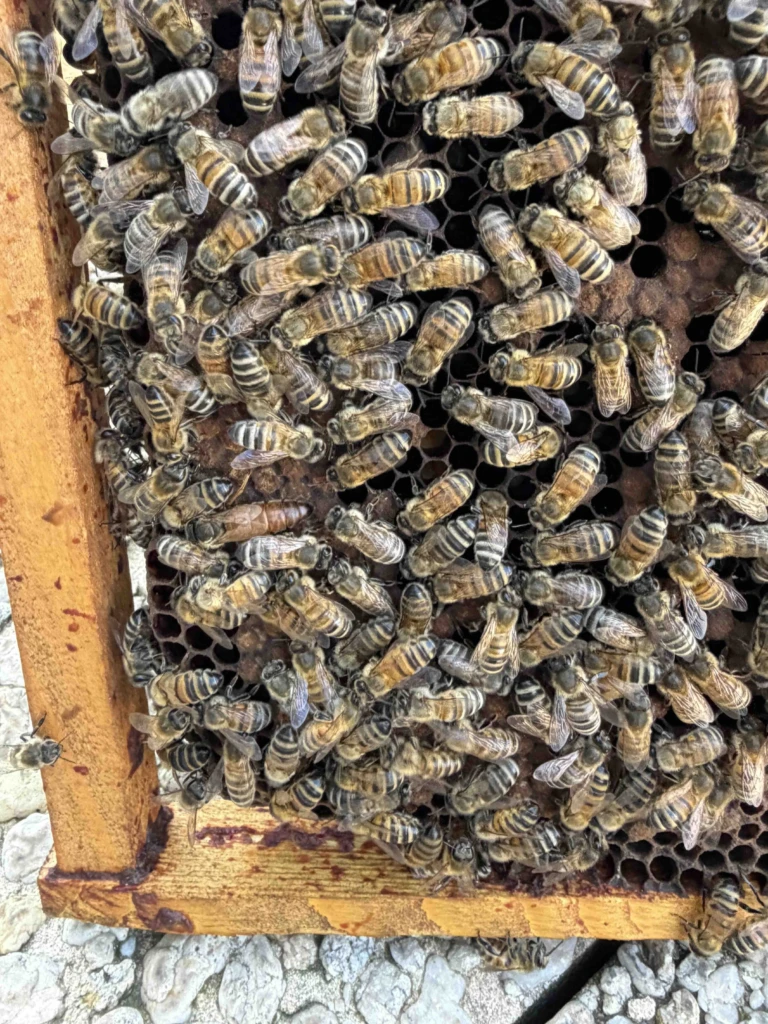 Les colonies se portent bien, les abeilles ne sont pas encore grappées, elles sont réparties dans tout l’espace. Et les ruches sont toujours bien garnies.