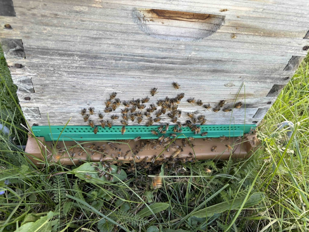La colonie se porte bien, les abeilles ne sont pas encore grappées, elles sont réparties dans tout l’espace et sont en train de défendre à la porte. C’est aussi le moment de retirer les languettes Apivar.