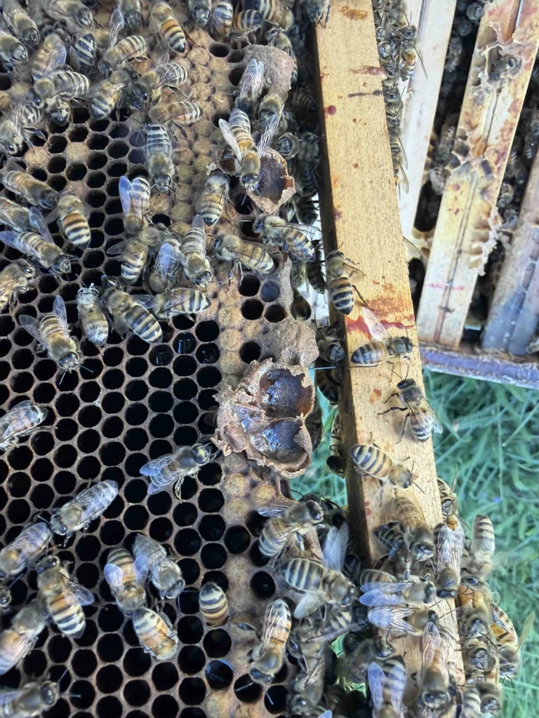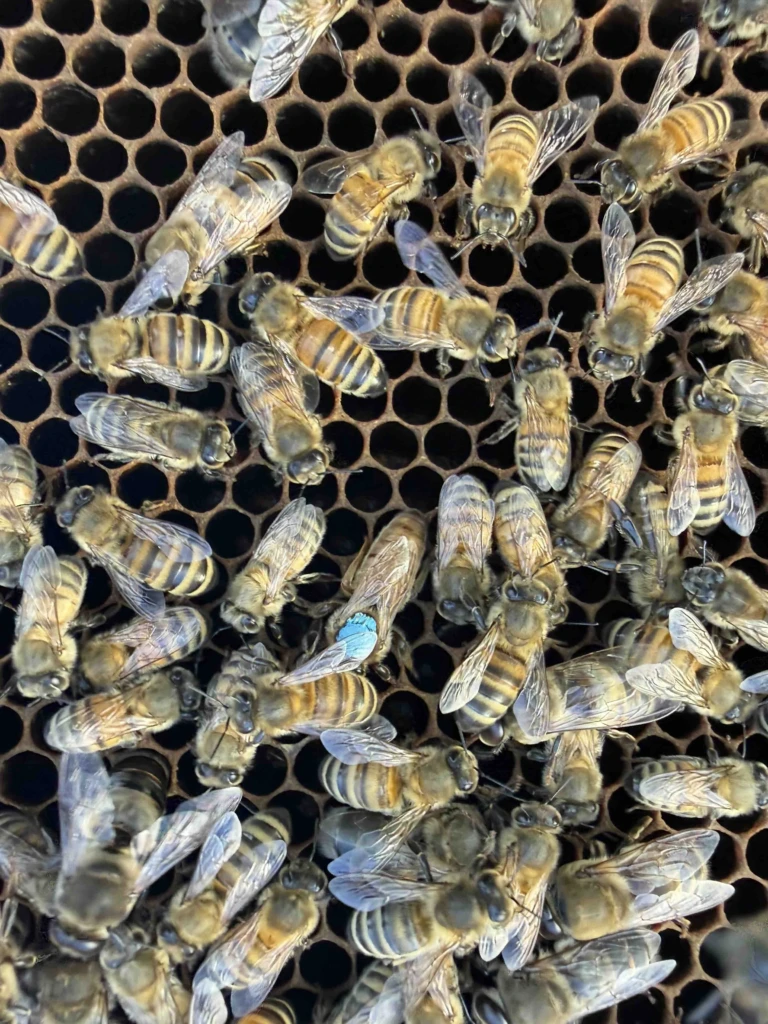 Superbe visite avec une météo très agréable. Les abeilles se pressent à la porte, je vais retirer le réducteur d’entrée. On profite de la visite pour chercher la reine : la voilà ! C’est la saison de reproduction et les abeilles et il y a des cellules royales.