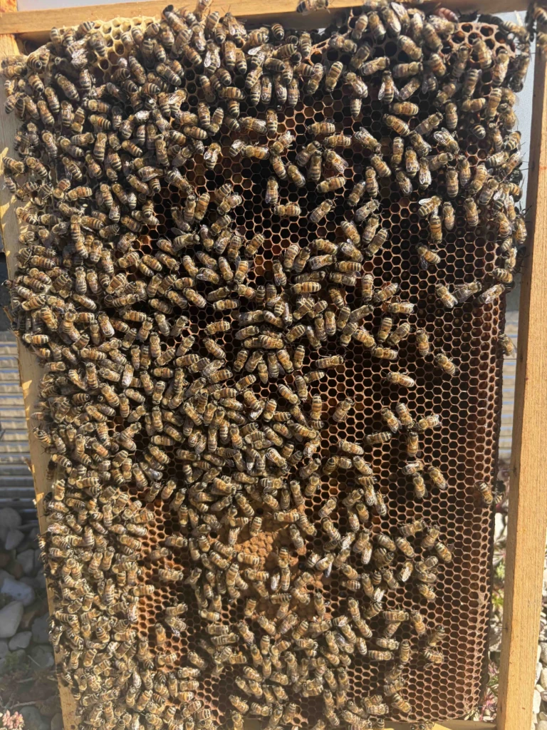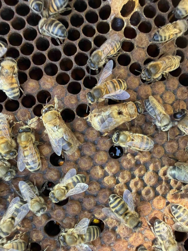 Les colonies se portent bien, il y a de bonnes réserves, les ruches sont insoulevables. Les 2 reines sont toujours là et elles pondent, les surfaces de couvains sont un peu plus petites qu’un fin de printemps ce qui est parfaitement normal. On voit encore de superbes réserves de pollen pour cette fin de saison.
