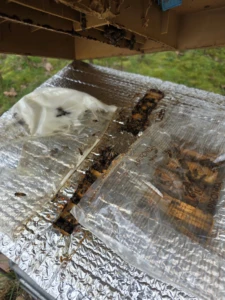 Nous avons également mis de l’appât dans le piège à frelons, car ils sont encore très présents autour des ruches ; mais pas de souci, la colonie est forte, populeuse et a beaucoup de réserve. Avec le froid qui devrait arriver, les frelons vont disparaitre et laisser nos ruches tranquilles.