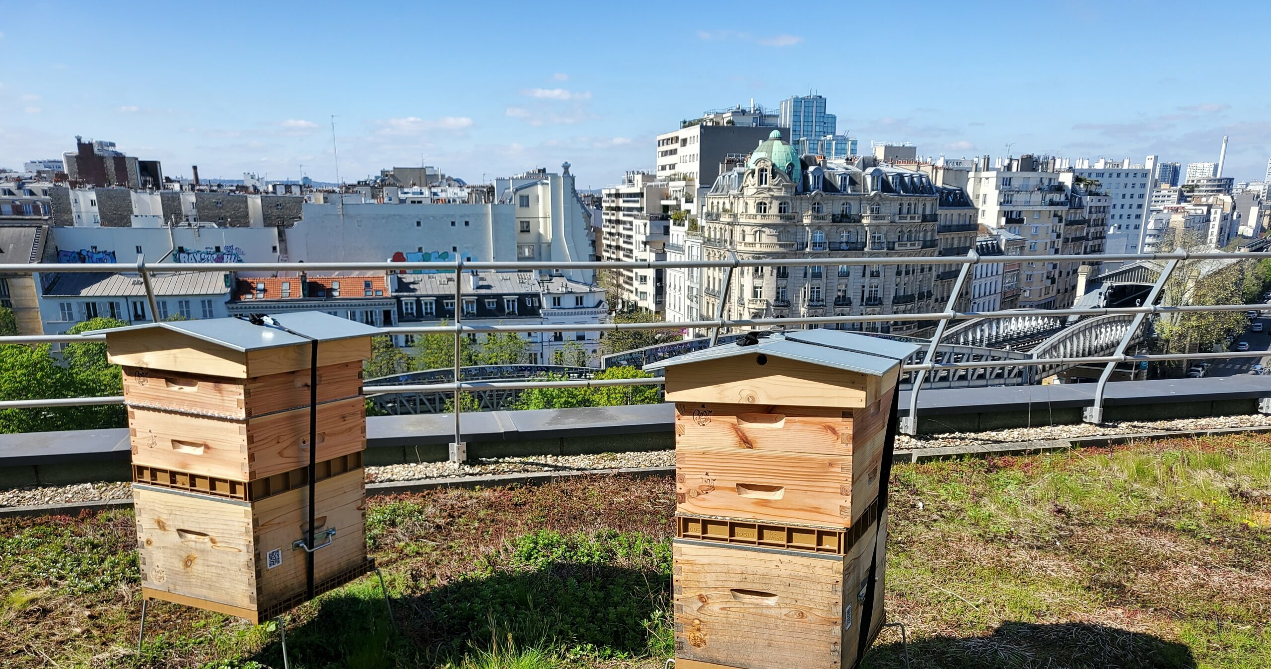 Les reines sont toujours présentes, les colonies se portent bien, il y a de bonnes réserves, et les surfaces de couvain sont en réduction, les colonies accueillent encore de nombreux faux-bourdons. On voit cependant une petite ouvrière butiner sur les fleurs du toit végétalisé.