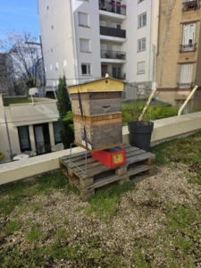 Elles font aussi leurs « vols de propreté » pour ne pas souiller la ruche. Les butineuses sortent pour chercher du nectar, mais aussi du pollen, leur source de protéines pour pouvoir produire de la gelée royale en grande quantité. C’est avec cette gelée qu’elles vont nourrir les larves de plus en plus nombreuses, car la reine a augmenté sa fréquence de ponte avec les beaux jours (jusqu’à 2 000 œufs par jour). Les butineuses étaient sur les fruitiers précoces comme les pruneliers, mais aussi les saules marsault, les muscaris et les crocus. Elles vont maintenant se tourner vers les lauriers des haies (Prunus laurocerasus) très communs autour de chez nous et les marronniers d’inde (Aesculus hippocastanum), grand pourvoyeur de pollen sur Paris en cette saison. Avec la chaleur et la nourriture, la population augmente rapidement dans la ruche. Les ouvrières s’activent à l’intérieur : nourrices, ventileuses, cirières (construction des rayons), etc. La colonie se prépare doucement à l’essaimage (formation d’une nouvelle colonie), qui arrive souvent en mai. Pour l’apiculteur, il faut surveiller d’un côté l’essaimage et de l’autre la météo, car la colonie a de nombreuses bouches à nourrir et une période de mauvais temps prolongée ralentirait fortement la croissance de la colonie et sa production de miel.