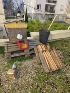 J’apporte une nouvelle colonie, dans une petite ruchette, que nous enruchons dans la ruche présente sur place.
