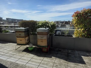 Elles font aussi leurs « vols de propreté » pour ne pas souiller la ruche. Les butineuses sortent pour chercher du nectar, mais aussi du pollen, leur source de protéines pour pouvoir produire de la gelée royale en grande quantité. C’est avec cette gelée qu’elles vont nourrir les larves de plus en plus nombreuses, car la reine a augmenté sa fréquence de ponte avec les beaux jours (jusqu’à 2 000 œufs par jour). Les butineuses étaient sur les fruitiers précoces comme les pruneliers, mais aussi les saules marsault, les muscaris et les crocus. Elles vont maintenant se tourner vers les lauriers des haies (Prunus laurocerasus) très communs autour de chez nous et les marronniers d’inde (Aesculus hippocastanum), grand pourvoyeur de pollen sur Paris en cette saison. Avec la chaleur et la nourriture, la population augmente rapidement dans la ruche. Les ouvrières s’activent à l’intérieur : nourrices, ventileuses, cirières (construction des rayons), etc. La colonie se prépare doucement à l’essaimage (formation d’une nouvelle colonie), qui arrive souvent en mai. Pour l’apiculteur, il faut surveiller d’un côté l’essaimage et de l’autre la météo, car la colonie a de nombreuses bouches à nourrir et une période de mauvais temps prolongée ralentirait fortement la croissance de la colonie et sa production de miel.