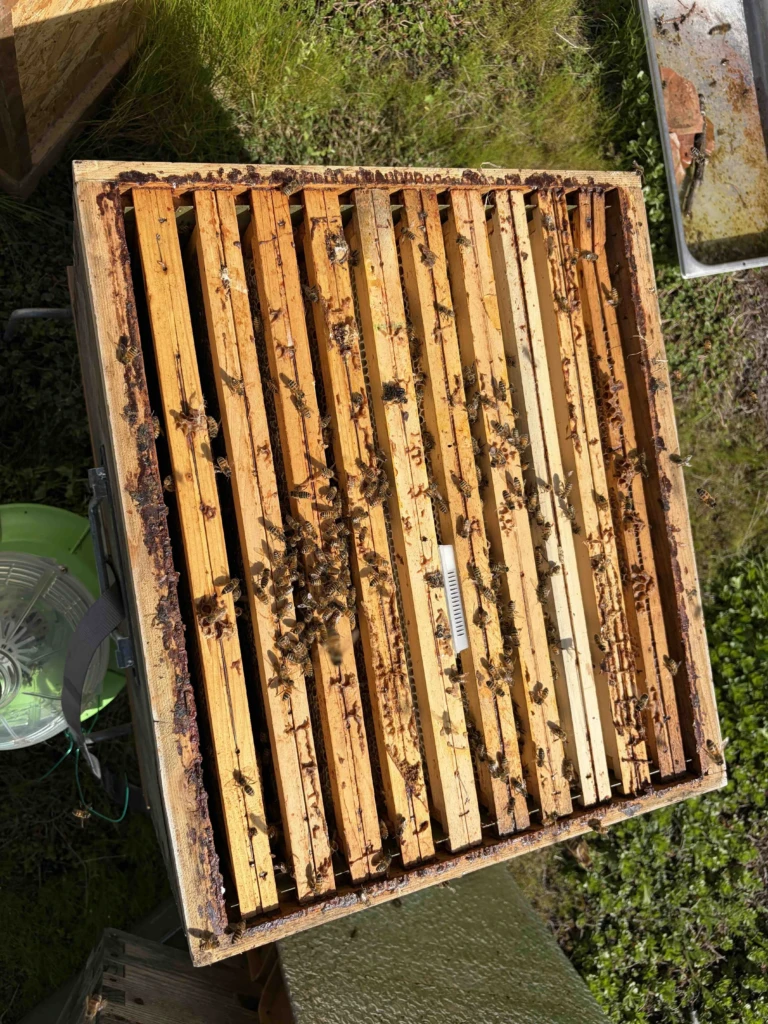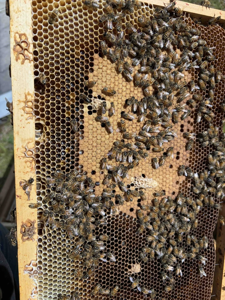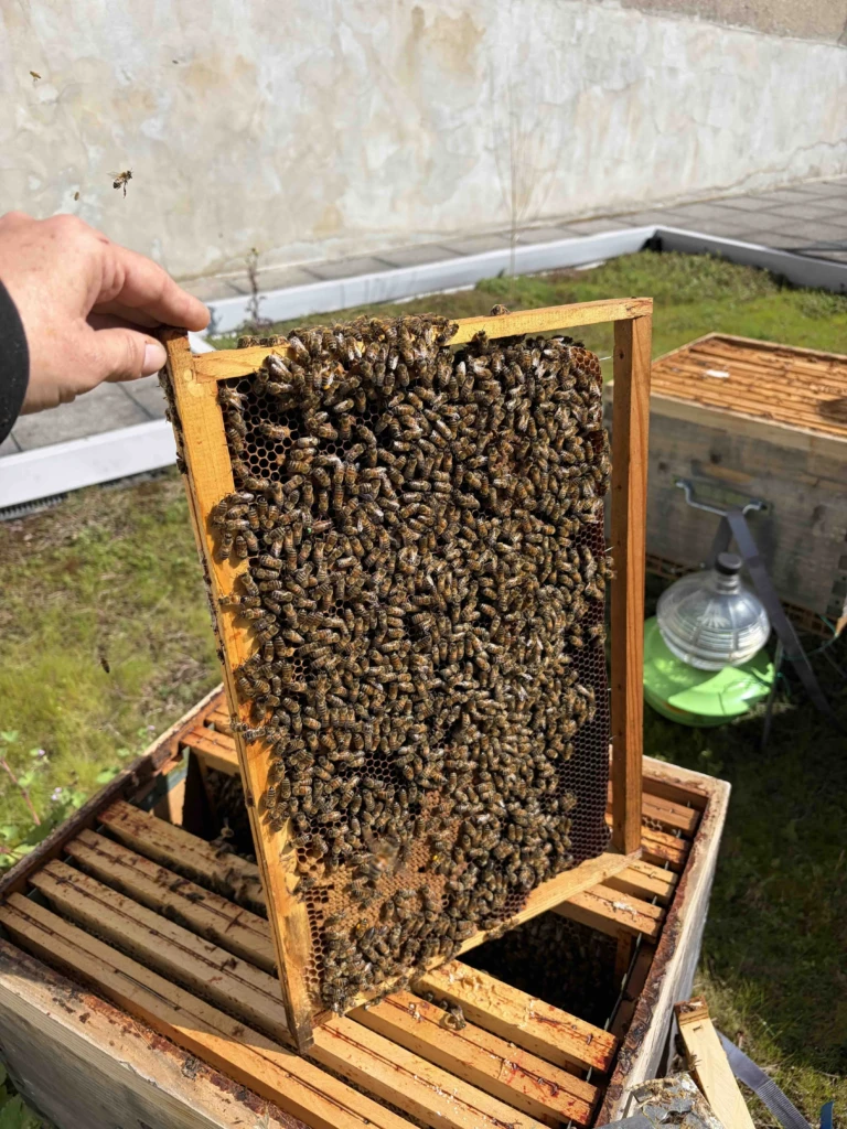 Superbe visite avec une météo très agréable. La colonie sur place est jolie, avec trois cadres de couvain et on a vu la reine ! Nous avions aussi une reine et 2 cadres de couvain ainsi qu’un cadre de réserves, avec du miel et du pollen pour repeupler la deuxième ruche. Nous avons transvasé les cadres et inséré une reine. Il n’y a plus qu’à attendre que les ouvrières mangent le bouchon de sucre pour libérer la reine.