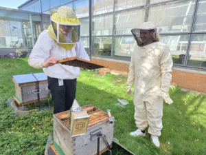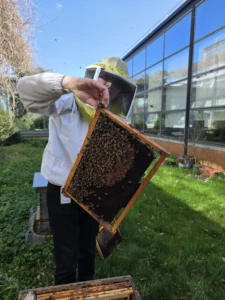 Nous avons vu de très belles colonies ! Sur les photos, vous pouvez voir une reine verte (introduite cette année dans une des ruches), Béatrice en plein travail ! , et un mâle (appelé faux-bourdon) que nous avons sur la main.