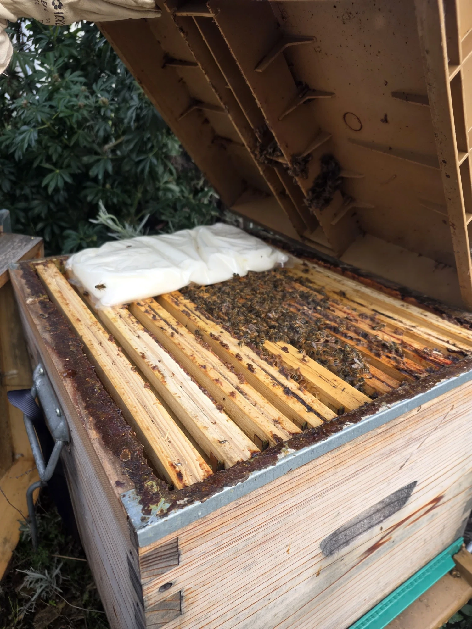 Nous avons une colonie magnifique (voir vidéo). Malheureusement, la deuxième colonie n’a pas réussi à passer l’hiver. Pour cette dernière, nous avons pu observer qu’il ne restait qu’une petite grappe d’abeilles. La reine n’a pas pondu suffisamment d’abeilles d’hiver à l’automne, certainement à cause de la pression des frelons. Il n’y avait donc pas assez d’abeilles pour maintenir une température adéquate dans la ruche.