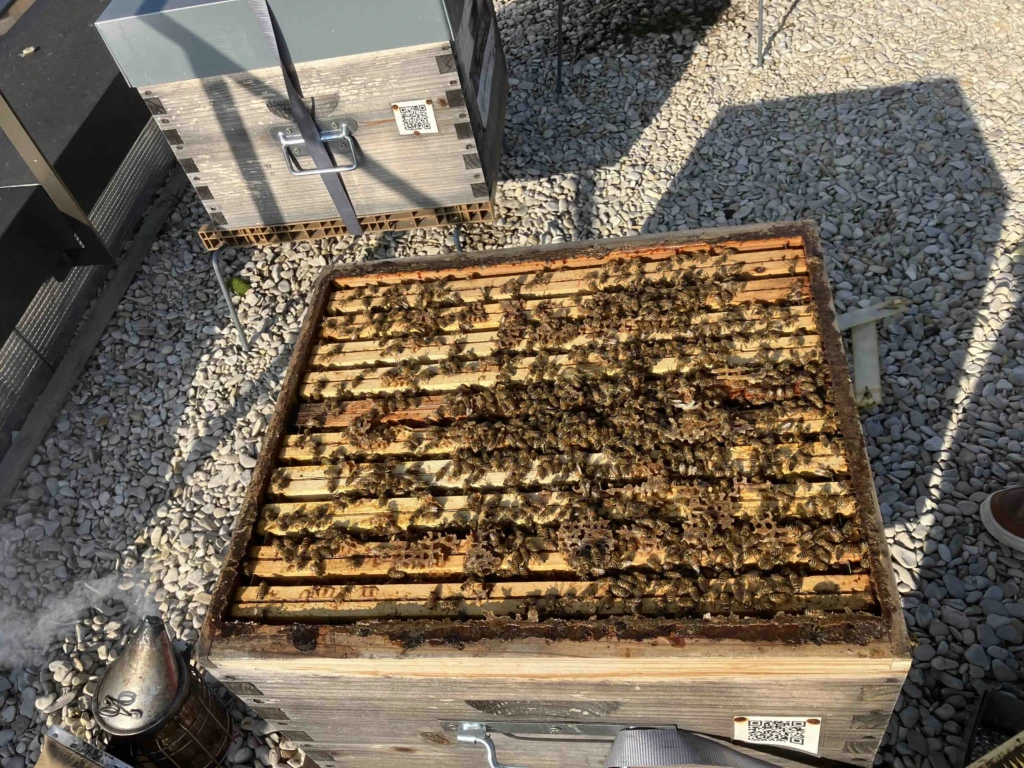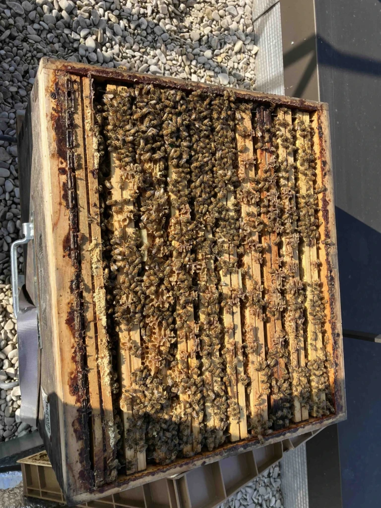 Les 3 colonies se portent bien, les abeilles ne sont pas encore grappées, elles sont réparties dans tout l’espace. Les ruches sont très lourdes et n’ont pas besoin d’être nourries. C’est aussi le moment de retirer les languettes Apivar.