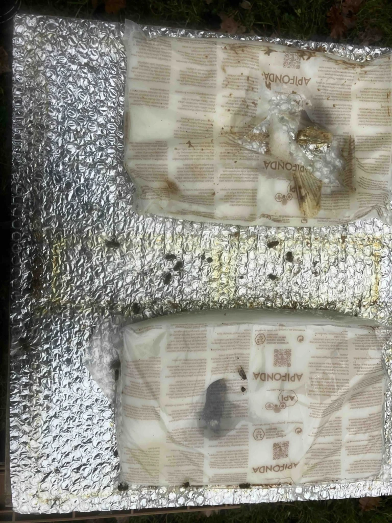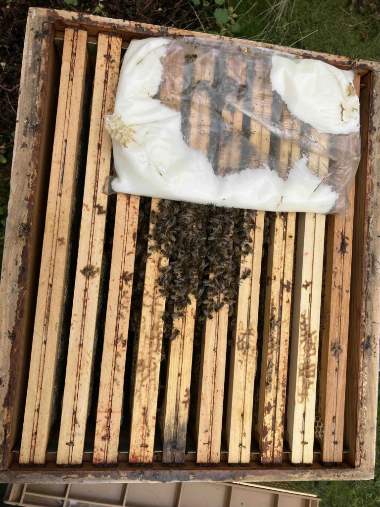 Les colonies sont belles. On ne se doute pas de leur taille, il faut soulever l’isolant. L’hiver avec le froid, les abeilles peuvent avoir des difficultés à se déplacer vers les cadres garnis de miel, avec cet apport de fondant : elles sont parées !