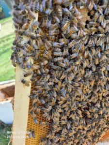 C’est une belle petite colonie. Je leur ajoute deux beaux cadres de miel.